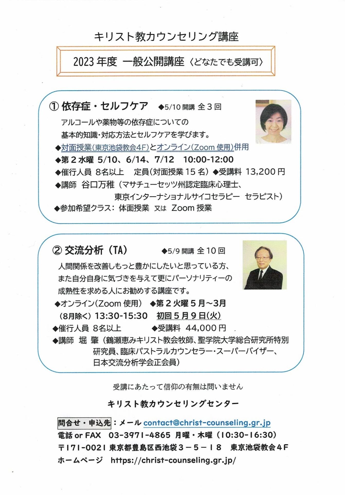 2023年度 一般公開講座 募集中!(どなたでも受講可能) 2023.04.10 どなたでもご参加いただける一般公開講座2講座を募集中! <5月から開講> お申し込み このフォームに入力するには、ブラウザーで JavaScript を有効にしてください。選択してください *① 依存症についてお支払い方法 *カード決済ゆうちょ振込*カード決済は海外からのお申込みの方に限らせていただきます。一般/回生 **卒業生は回生を、初めての方は「一般」とご記入ください名前 *メール *かな *電話番号 *住所 *所属団体・教会がございましたらお書きください受講動機をお書きくださいこのコースを知ったきっかけ *Web検索チラシ郵送されてきた案内その他今すぐ申し込む LINE note 2/25開催 講演会 「大切な人との別れにあなたは何を言う」 限定動画配信終了のお知らせ 前の記事 訃報 堀肇先生が召天されました 次の記事