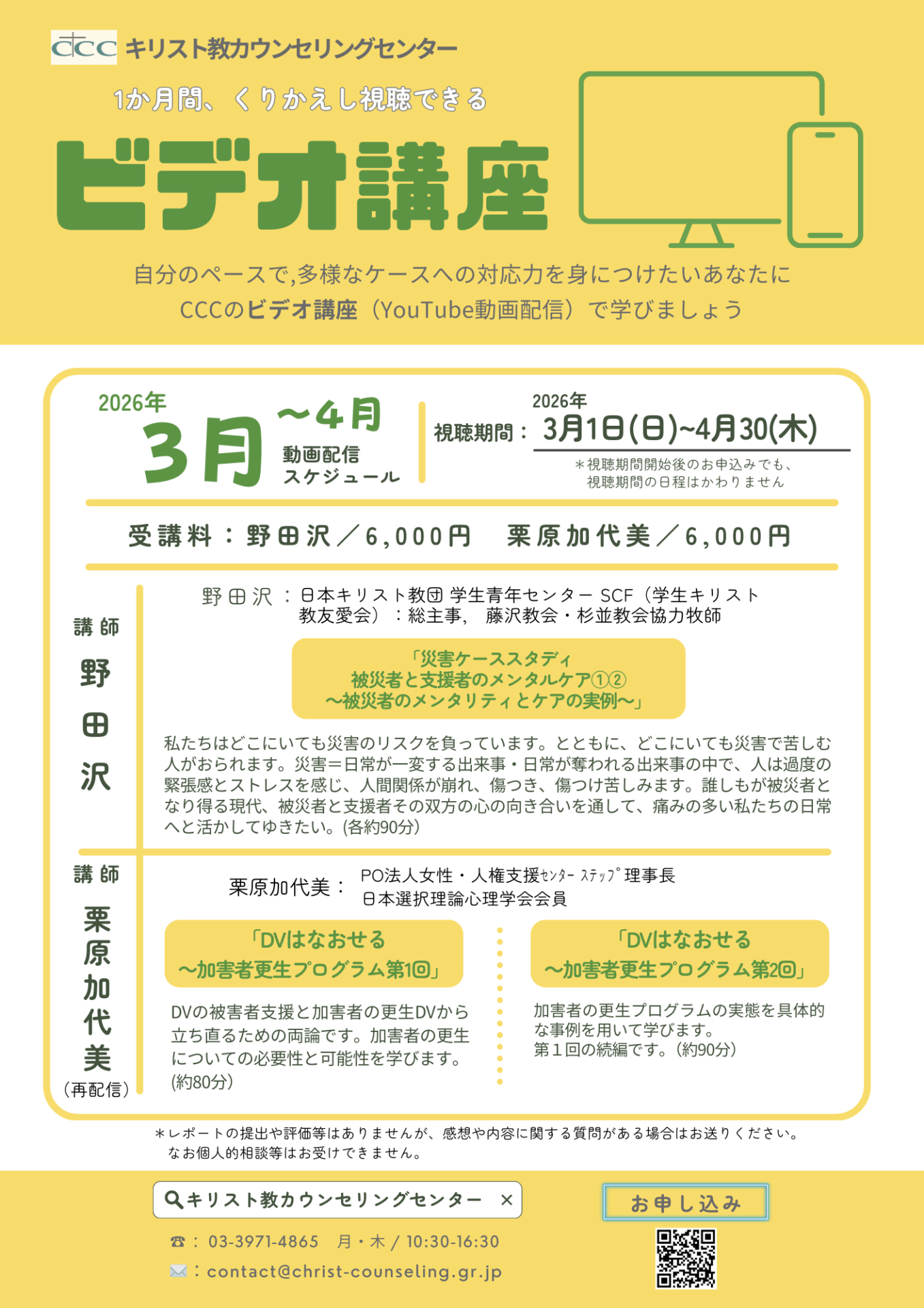CCCのビデオ講座 3月~4月の配信 2026.02.19 ビデオ講座はYouTubeで動画配信する新しいスタイルの講座です。期間中(2か月間)何度でも動画を視聴することが出来ます。 お申し込み オンライン無料説明会!「キリスト教カウンセリング講座」(2026年度)の無料説明会を開催します。 前の記事